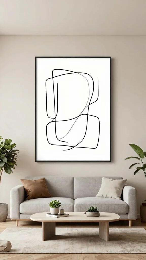 Incorporate abstract line art to add a modern, minimalist touch that enhances your living room’s aesthetic.