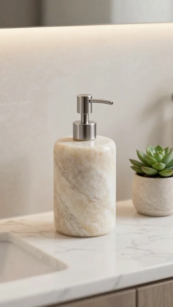 A natural stone soap dispenser adds a touch of sophistication to any bathroom. Materials like marble or granite not only serve a practical purpose but also elevate your decor. The cool, smooth surface of stone contrasts beautifully with warm wood accents or soft textiles, creating a balanced and inviting atmosphere. Imagine a sleek marble dispenser paired with a rustic wooden tray for an eye-catching vignette.
