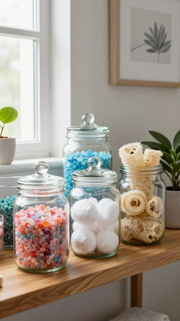 Embrace sustainability with recycled glass storage jars that elevate your bathroom organization. These stylish containers are perfect for storing everything from cotton balls to bath salts while adding a sophisticated flair. The transparency of glass allows you to easily see your essentials, creating a neat and tidy appearance. Imagine colorful bath salts displayed in a clear jar, brightening up your countertop.