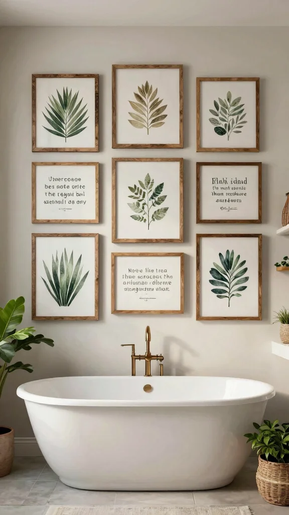 When selecting wall art, pick pieces that resonate with you and enhance your bathroom’s mood. Mixing different frame styles can create an eye-catching gallery wall effect, adding depth and interest to your space.