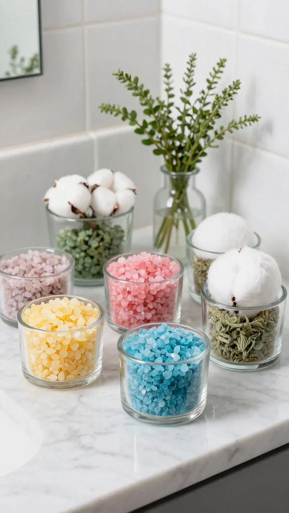 Recycled glass containers are an excellent eco-friendly choice for your bathroom organization. They provide a chic way to display essentials like cotton balls, bath salts, and other items while maintaining a clean aesthetic. Available in various shapes and sizes, these containers fit seamlessly into any decor style, adding elegance to your space.