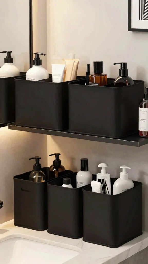Incorporating sleek black storage bins elevates organization while enhancing the overall aesthetics of your modern bathroom.