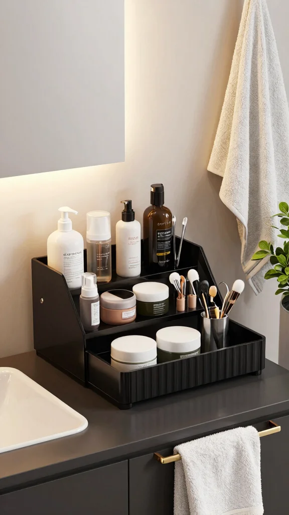 Incorporating a modern black countertop organizer streamlines your routine while enhancing the beauty of your space.