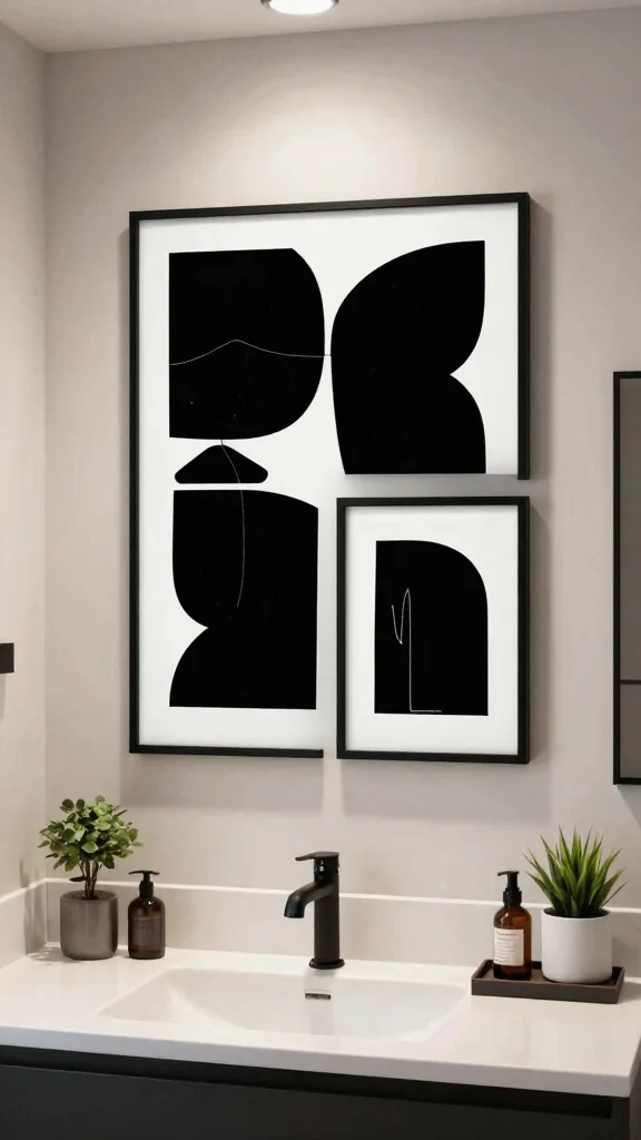 Black wall art adds a striking focal point to your bathroom, enhancing its overall appeal. Choose pieces that resonate with your personal style, such as abstract designs or minimalist prints. A well-framed piece can lend elegance and sophistication to your space.