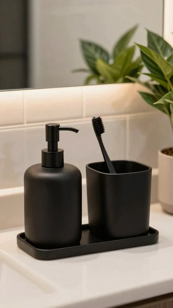 For a minimalist, modern bathroom, start with a cohesive set of black bathroom accessories—think a matte black soap dispenser, toothbrush holder, countertop tray, towel bar, and a waste bin.