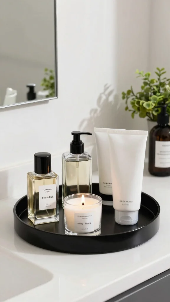 Incorporating a black decorative tray elevates your organization while enhancing the sleek design of your bathroom.