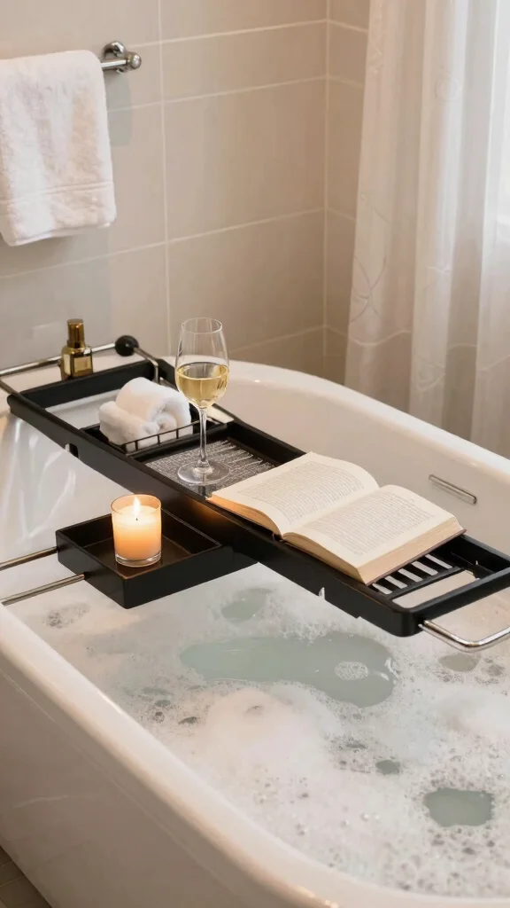Incorporating a luxurious black bath caddy brings both style and functionality, making every soak a special occasion.
