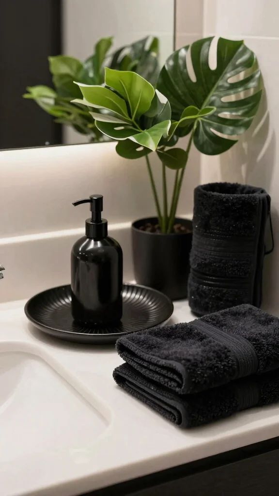 Keep the palette limited to 2-3 black pieces plus bright accents for a balanced sleek bathroom design.