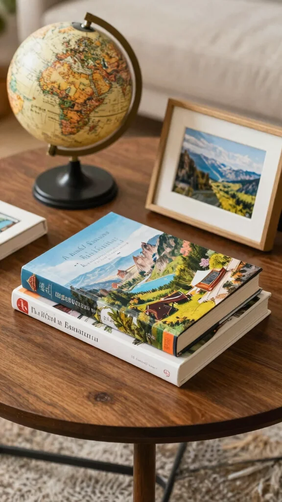 This arrangement evokes fond memories and invites conversation about travel adventures. You can source travel-themed books and decor items from local shops or online marketplaces at reasonable prices.