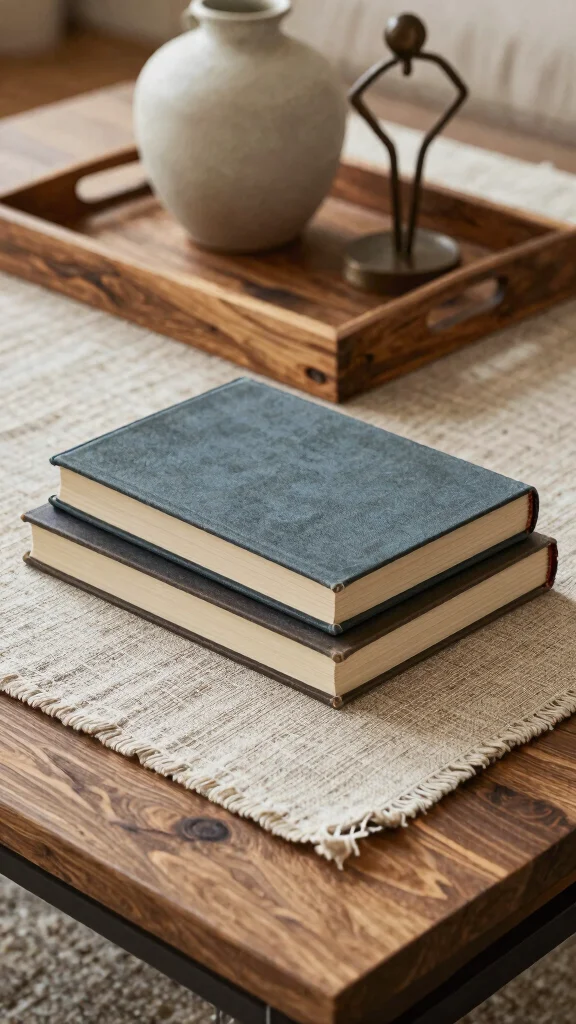 Add one stylish coffee table accessory—like a small plant, ceramic object, or candle—and keep a little negative space so the arrangement feels deliberate. This approach keeps decorative book arrangements looking chic, a staple in decorative book arrangements and interior design ideas.