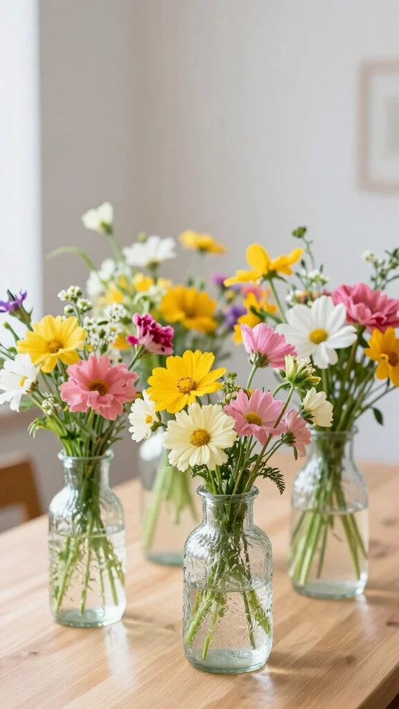 To make the most of this look, consider sourcing local wildflowers for an eco-friendly touch. You can create a dynamic arrangement by mixing various types and colors, or even use just one standout variety for a more streamlined effect. Position these arrangements in groups to enhance their visual appeal while maintaining a minimalist vibe.