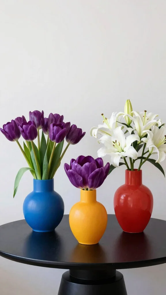 If you love vibrant design, bold color block vases paired with monochrome flowers create a stunning visual impact. This arrangement is perfect for making a statement in any minimalist setting, while still maintaining a chic and polished look. The contrast between the colorful vases and uniform flower tones draws the eye and adds excitement to your decor.