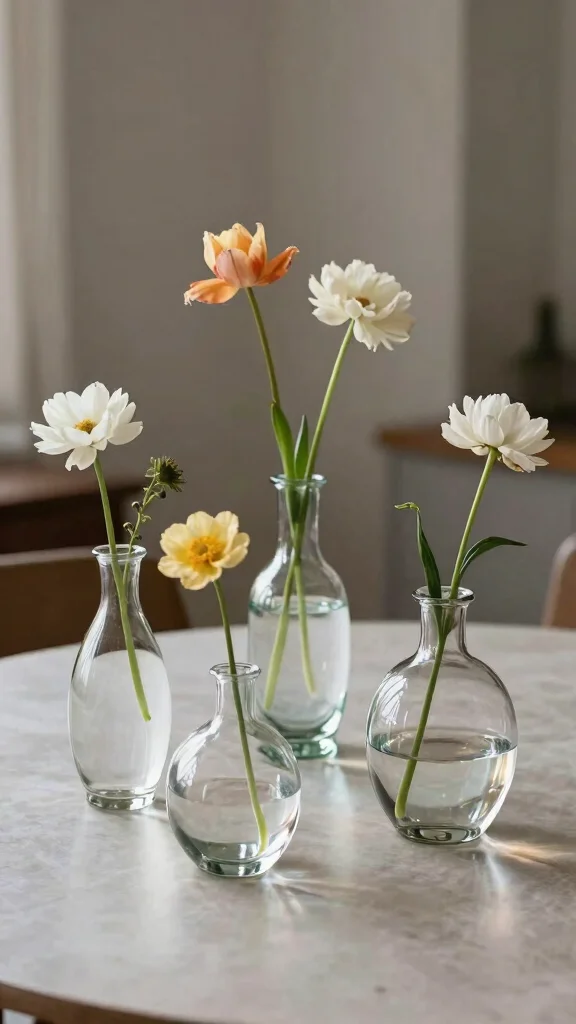 Choose a simple vase design—clear glass or a matte ceramic—and group 2–4 vases on a shallow tray to create a quiet, elegant table centerpiece. Stick to a cohesive palette (neutrals with a single accent color) so every stem has room to breathe.