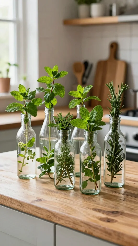 To create this look, start by cleaning and repurposing old glass bottles, which adds a personal touch to your decor. Use herbs that you enjoy cooking with, blending practicality with aesthetics. Position these vases in your kitchen or dining area for a fresh, aromatic experience.