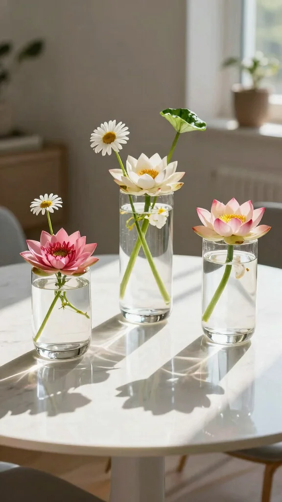 Clear acrylic vases introduce a contemporary twist to classic floral arrangements. By placing floating flowers, like lotus blossoms or gerbera daisies, you can create an eye-catching centerpiece that feels light and airy. The transparent nature of acrylic allows for a unique visual that draws attention without overwhelming your minimalist decor.