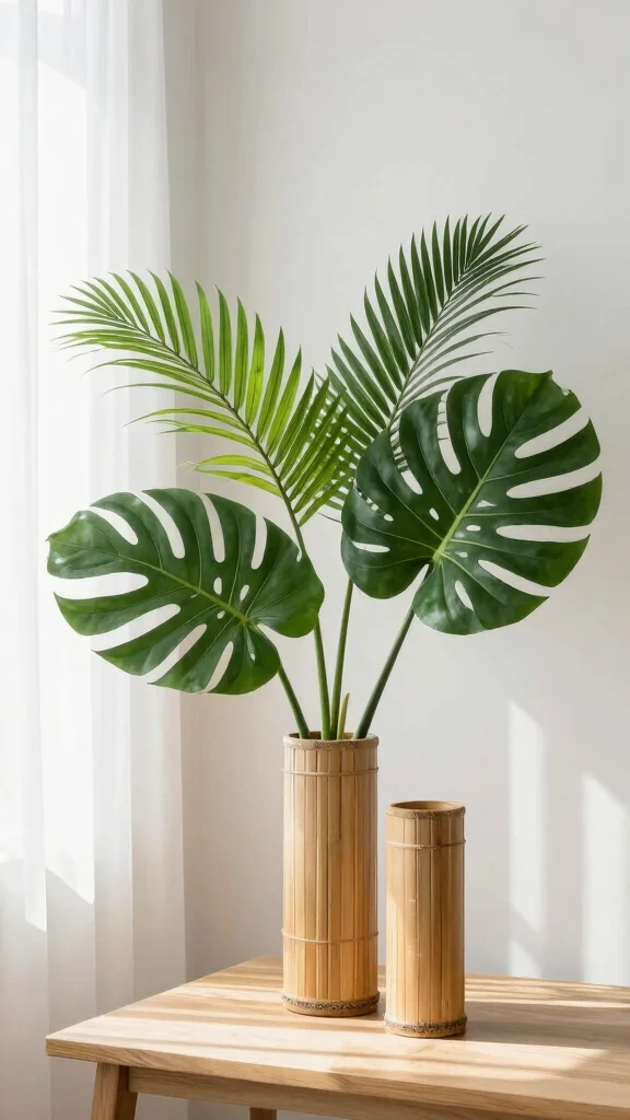 To enhance this look, use a variety of greens in different shades to add depth and interest to your arrangement. Position these vases in well-lit areas to maximize their freshness and visual appeal, allowing the natural materials to shine.
