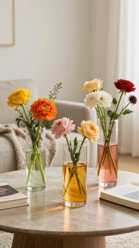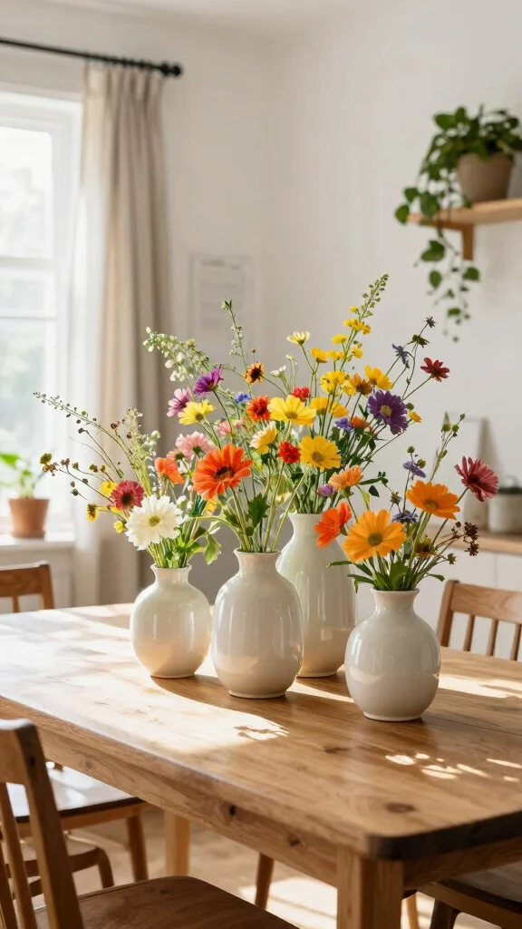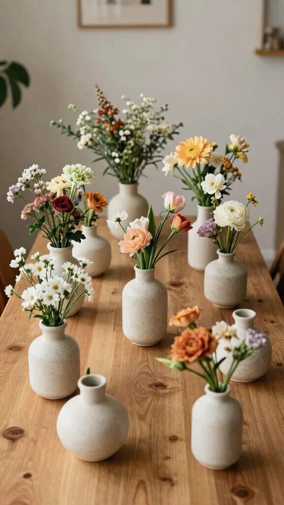 Start with 3–5 bud vases of varying heights, arranged on a tray or muted wood surface to form a simple table centerpiece. Use seasonal blossoms or even dried/preserved stems to cut water usage and waste. Choose glass vases or upcycled ceramics to maximize longevity, and reuse stems and water where possible. Keep colors cohesive and restrained to fit minimalist decor, so your simple flower arrangements feel intentional and sustainable.