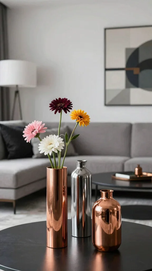 Copper and metal vases introduce an industrial chic aesthetic to your home. Their reflective surfaces and unique patinas create captivating displays, especially when paired with bold flowers. They add a modern twist to any room.