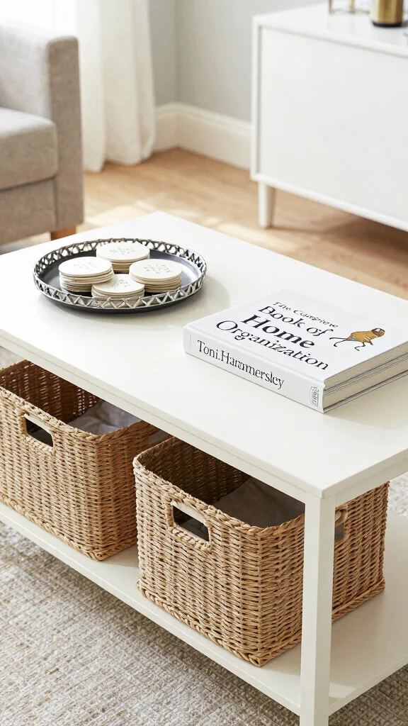 ‘The Complete Book of Home Organization’ by Toni Hammersley merges organization with stylish decor, perfect for creating a clutter-free coffee table. Hammersley shares practical strategies for organizing small spaces, ensuring your coffee table remains both beautiful and functional. She advocates for blending style with practicality, showcasing how decorative storage solutions can enhance your decor.To implement her ideas, consider using stylish baskets or trays to keep items organized while maintaining an inviting look. Thrift stores often have affordable options that can elevate your coffee table’s style.Here are some strategies to consider: