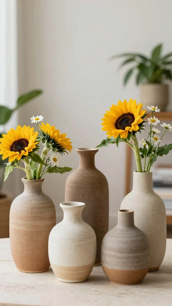 For a warm, earthy feel, choose matte ceramic or wooden vases in earthy tones. Consider scale; a vase that is too small can vanish on a table, while one that is too large can overwhelm the layout.