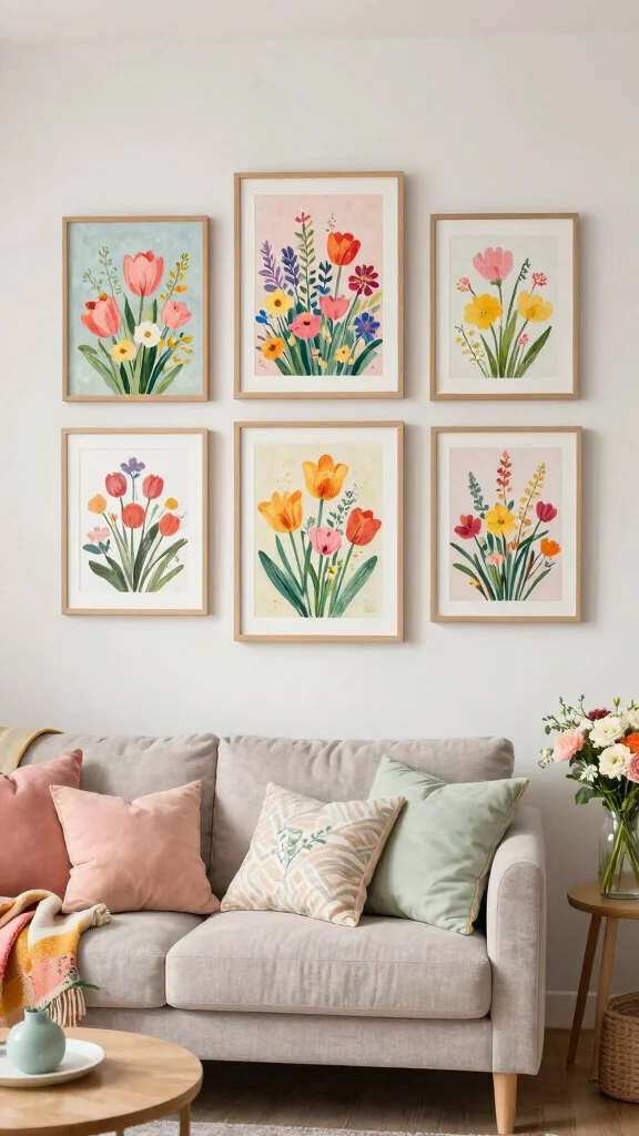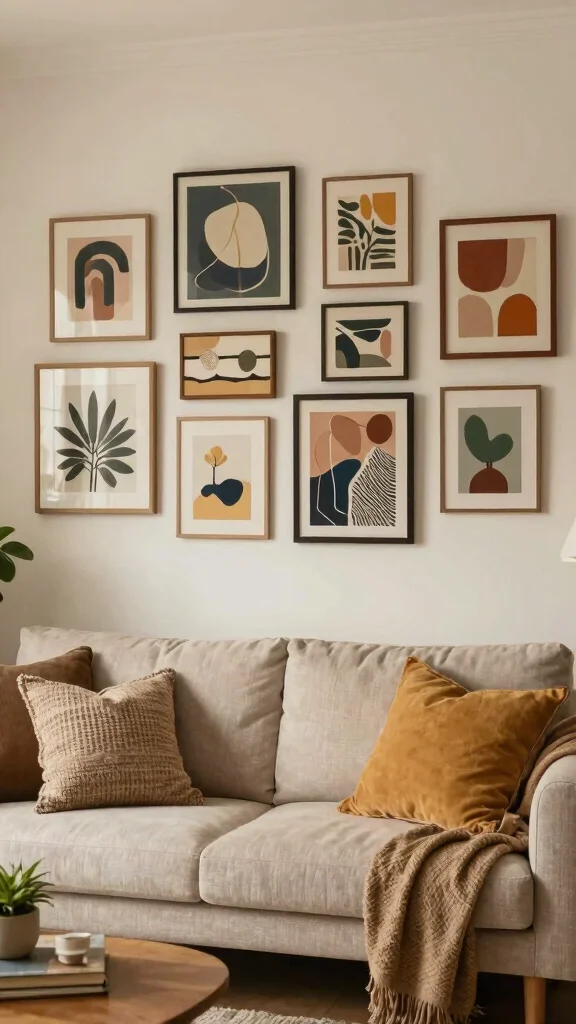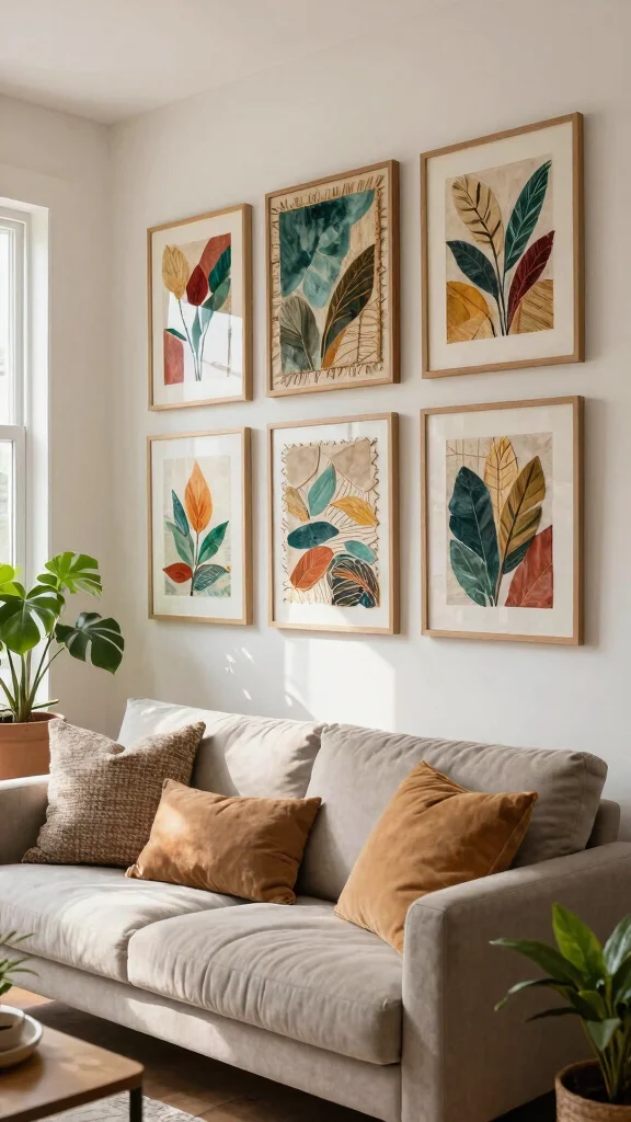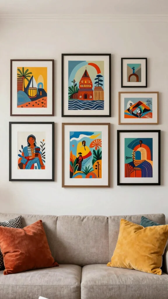 To implement this look, consider mixing frame styles for visual intrigue. A sleek black frame can make colorful art pop, while a white frame might soften the overall presentation. Don’t hesitate to experiment with layout; a grid or casual salon-style arrangement can add a contemporary feel to your space.