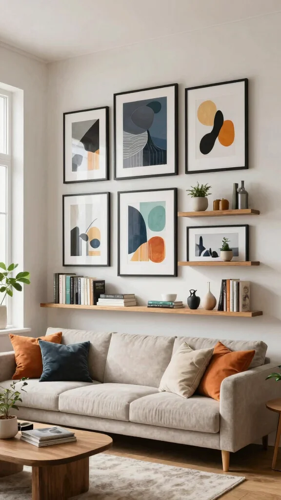 Integrate framed art with shelving for a stylish and functional decor solution. Floating shelves can display framed pieces alongside books, plants, or decorative objects, creating layered looks that add depth to your walls. This method is perfect for smaller living spaces, maximizing vertical areas without cluttering surfaces.