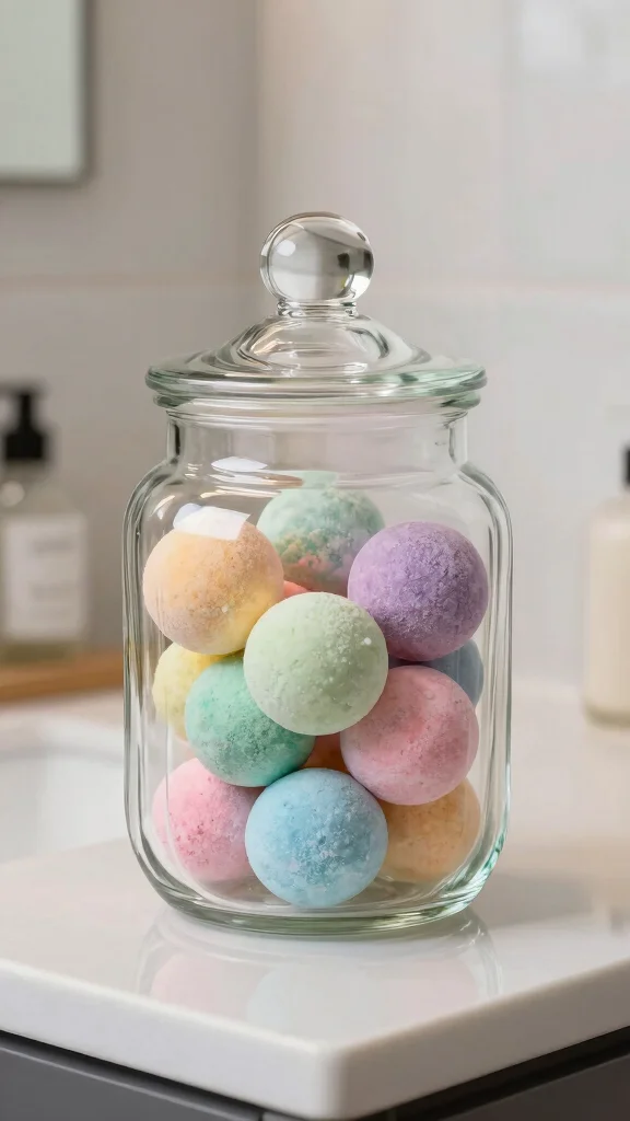 A glass container for bath salts is both functional and decorative in your bathroom. Choose a stylish jar that fits your decor, filling it with colorful bath salts that showcase your personality. This not only keeps your salts organized but also makes them easily accessible for your relaxing baths.