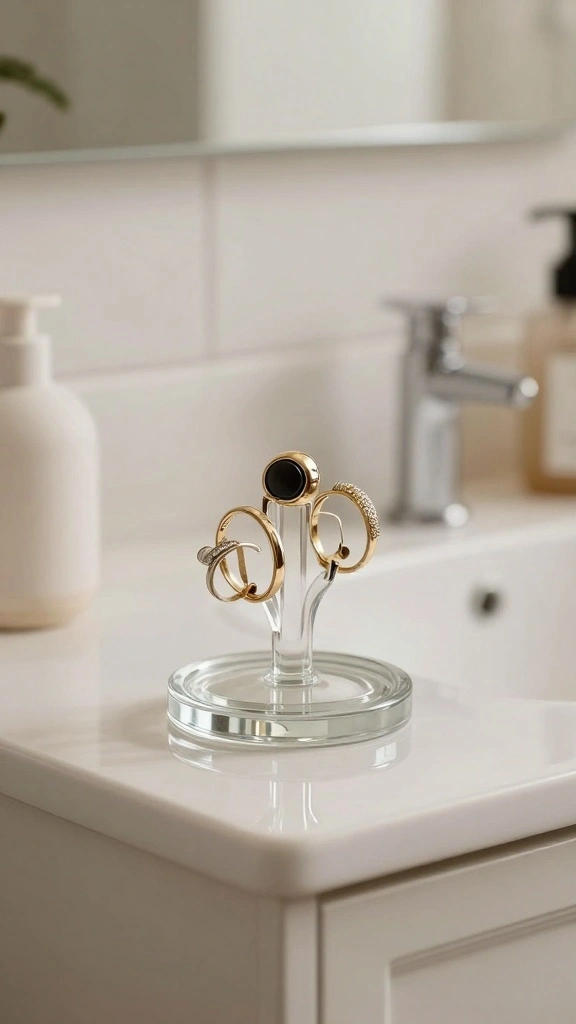 Incorporating a glass ring holder elevates the aesthetic of your bathroom while providing practical organization.