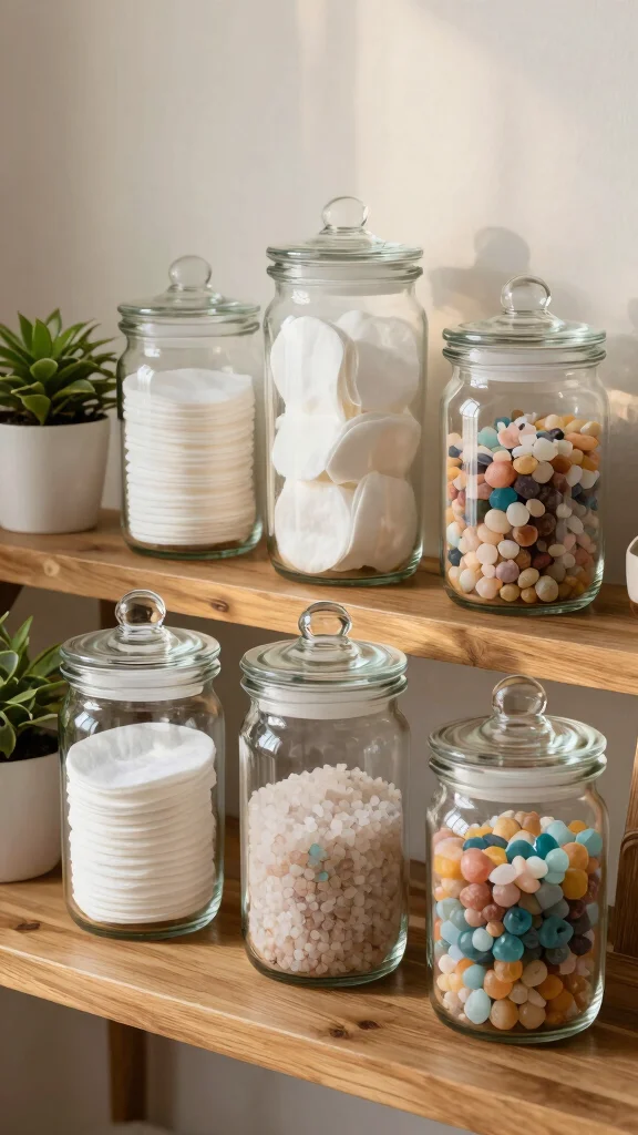 Use elegant glass storage jars for organizing items while adding a touch of sophistication to your decor.