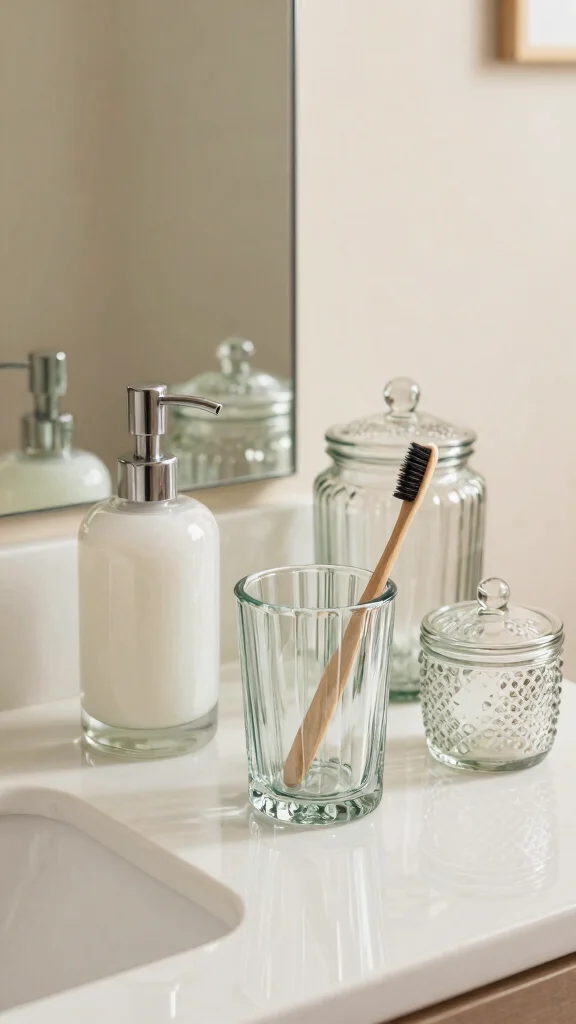 Look for pieces made from recycled or sustainably sourced glass—these are eco-friendly options that still look sleek in modern glass decor. Great picks include a glass soap dispenser and matching toothbrush holder, clear glass storage jars with airtight lids, and slim glass shelves for bathroom essentials. Pair them with a simple frame in metal or bamboo to keep the look stylish bathroom accessories. Measure your countertop and choose uniform heights for a cohesive, elegant glass accents look.