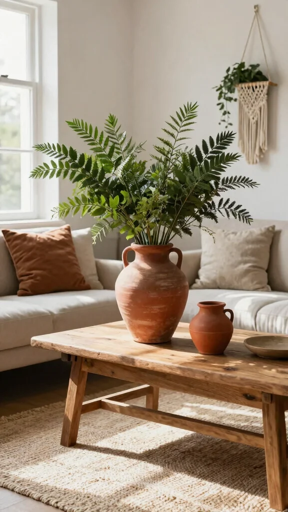 For a bohemian touch, mix textures like ceramic, terracotta, and woven vessels in warm earthy tones to add tactile interest.