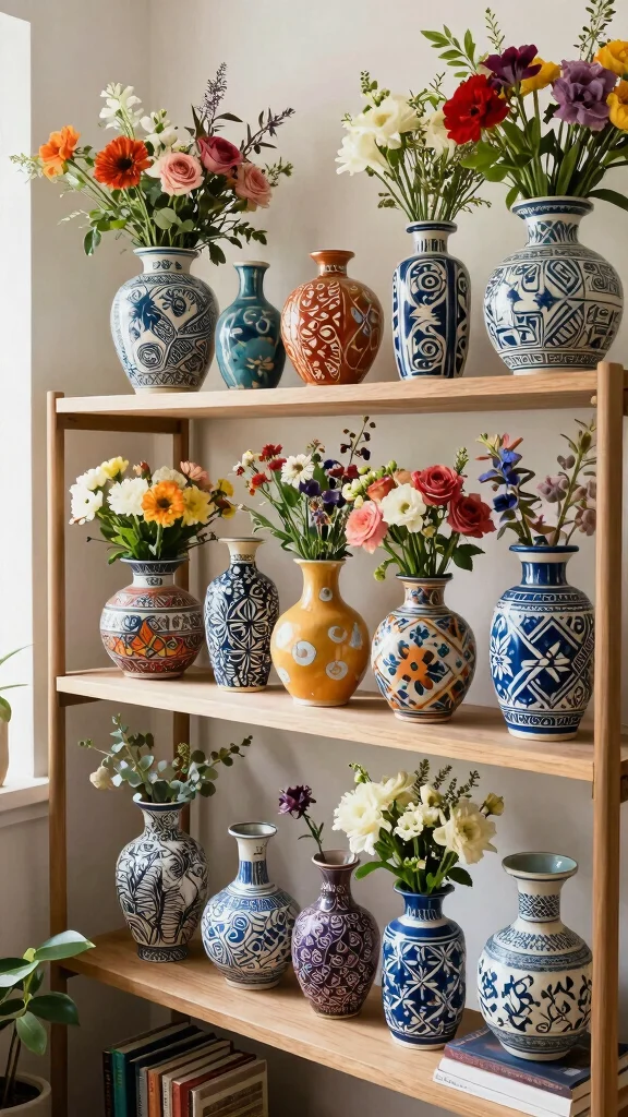 Incorporating patterned vases can add visual excitement to your space.