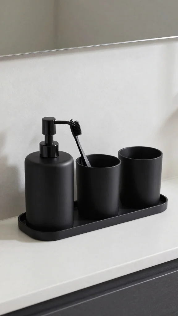 A matte black bath accessories organizer is perfect for maintaining order among your essentials. Choose a design with multiple compartments to separate items like razors, brushes, and skincare products, enhancing both functionality and style. This accessory helps reduce clutter, contributing to a modern vibe in your bathroom.