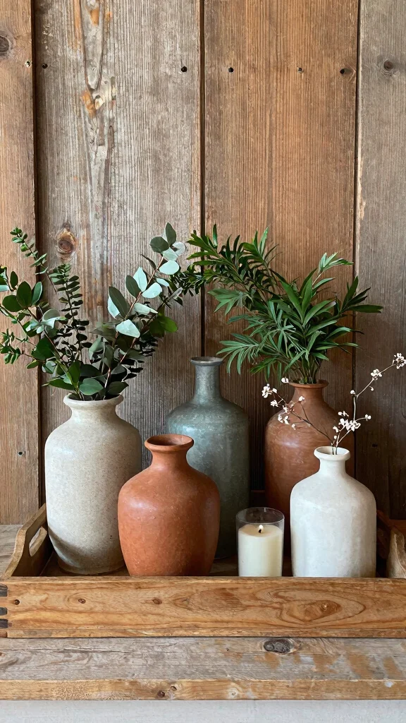 Embrace the rustic farmhouse aesthetic by artfully grouping old vases on a wooden tray! This display method creates visual interest while telling a story through your decor. Picture a variety of vases in muted greens and whites, arranged beautifully on a weathered tray, exuding charm and warmth.