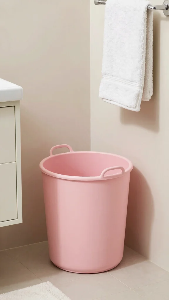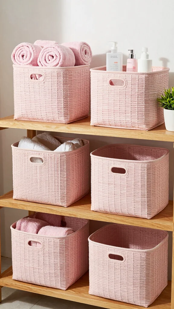 Decorative storage baskets in soft pink provide a stylish solution for bathroom organization. These versatile pieces can hold towels, toiletries, or cleaning supplies, helping you maintain a neat environment. Look for woven or fabric options that introduce texture and warmth to your space.