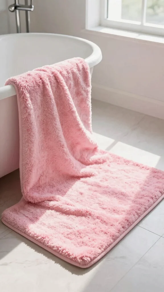 Start your pink bathroom makeover with a fluffy pink bath mat for comfort and style.