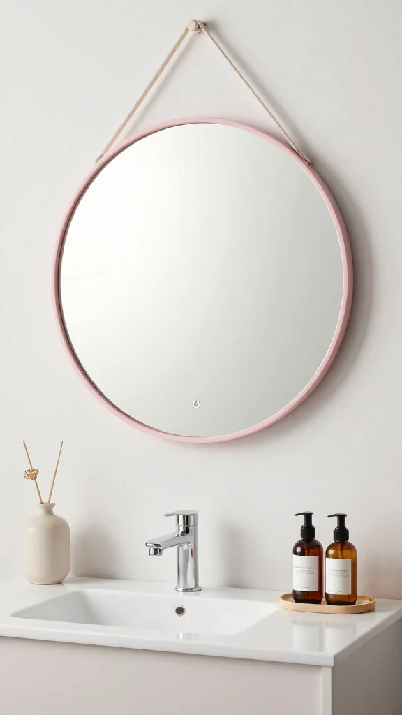 An elegant mirror isn’t just decor—it’s space magic. In a pink bathroom, a round vintage mirror above the sink can visually expand the room and bounce light, making soft, playful decor feel brighter and more inviting.