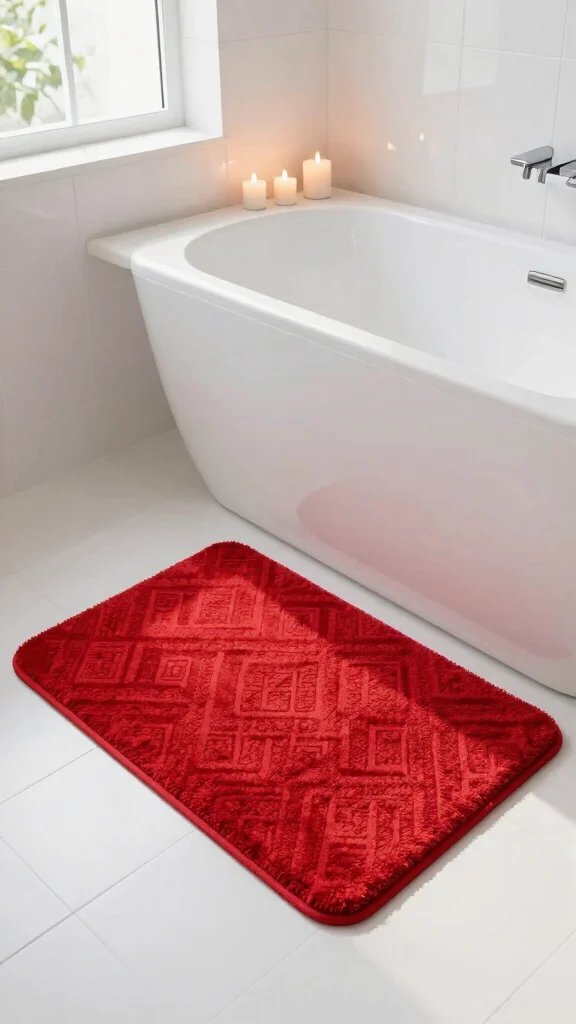 When selecting your bath mat, consider different textures, such as plush or woven, to elevate the space’s visual interest. Ensure it aligns with your red theme by coordinating with other accessories. Safety is crucial, so opt for mats with non-slip backing to prevent any accidents in wet areas.