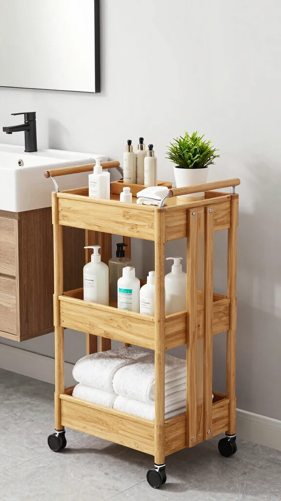 Compact bathroom carts are your secret weapon for maximizing storage in tight spaces. These rolling carts provide a stylish solution for organizing essentials while being easy to move around. Opt for designs made from eco-friendly materials, like bamboo or recycled metal, to keep your decor sustainable and chic.