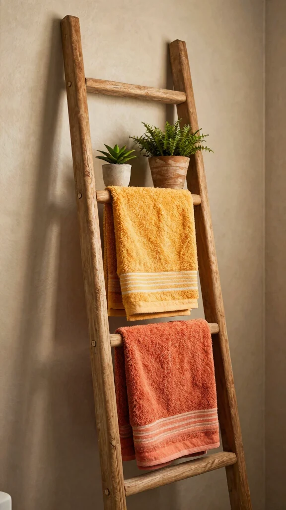 Use this ladder to hang towels and even showcase small plants or decorative items for a bohemian touch. It keeps towels easily accessible while enhancing the overall decor.