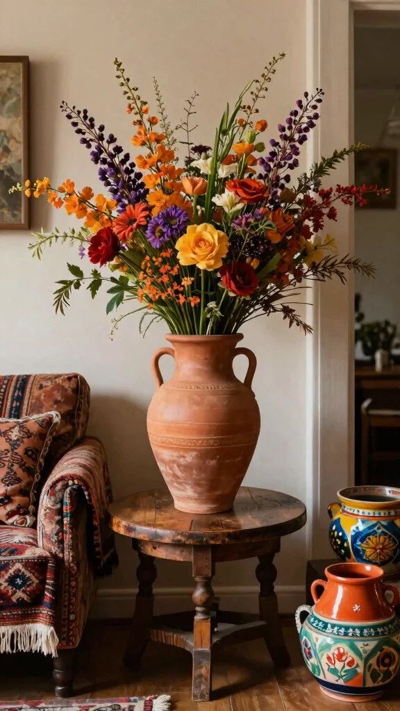 – Pair a terracotta vase with colorful flowers for a lively display.