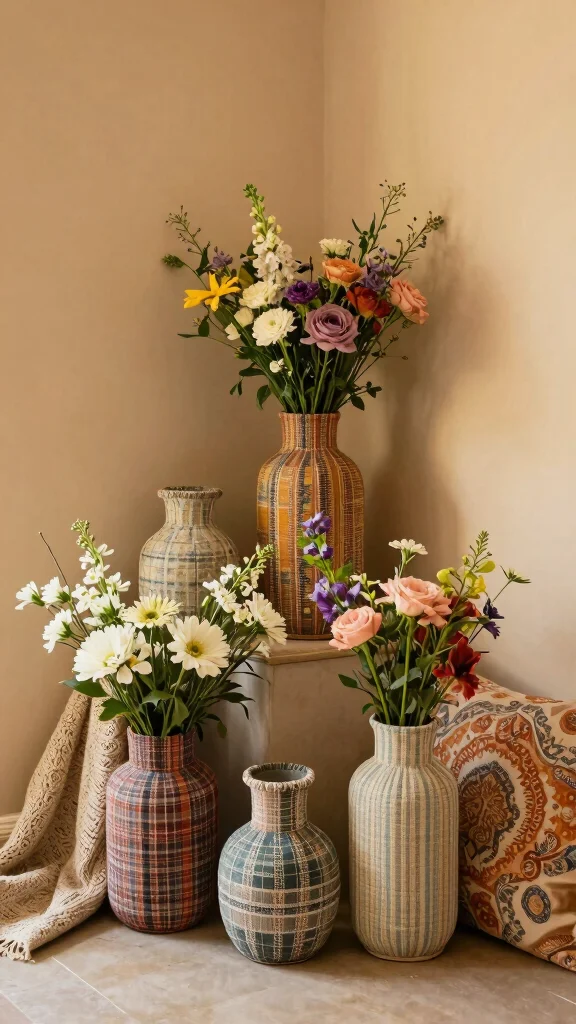 For a soft, textural element, consider fabric-wrapped vases. These unique pieces can be customized with any fabric, bringing color and warmth to your decor. Their versatility allows you to mix patterns and textures, showcasing your creativity.