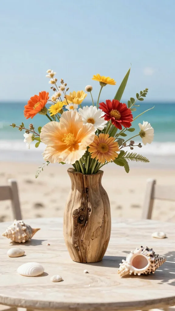 Bringing beach vibes into your home, driftwood vases offer a unique, natural aesthetic. Using pieces of driftwood to create a base for your floral arrangements adds rustic charm and character. This eco-friendly option not only looks beautiful but also utilizes materials found in nature, connecting your decor to the outdoors.