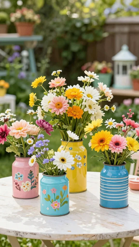 Repurpose tin cans by painting them in vibrant colors to create eye-catching and eco-friendly vases.
