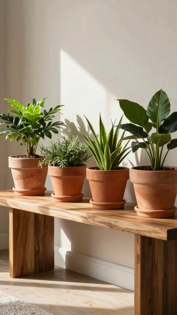 For an impressive arrangement, group pots of different sizes together to create visual interest. Adding a layer of pebbles at the bottom helps with drainage, ensuring your plants thrive. This simple yet effective decor idea connects you with nature while adding freshness to your space.