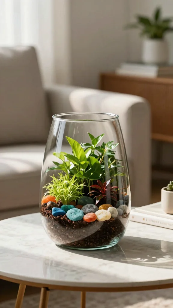 Terrariums are a stylish way to bring a slice of nature indoors, doubling as beautiful vases. These glass containers can house small plants, moss, and decorative stones, allowing you to create a mini garden that’s low-maintenance and visually appealing. Layering elements like soil, rocks, and plants mimics natural landscapes, providing a refreshing touch of greenery in your home.