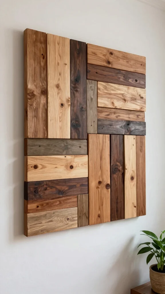 To implement this aesthetic, gather wood scraps and sand them down to create a polished finish. Arrange these pieces in a captivating pattern on your wall, ensuring a creative design that suits your space. Consider budget-friendly options by sourcing wood from local salvage yards or DIY stores.