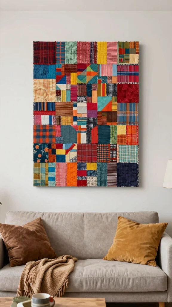 Fabric scrap collages offer a creative way to utilize leftover materials while adding a unique piece of art to your wall. This design transforms various fabric pieces into a larger, visually striking image or pattern, allowing for personal expression and creativity. The result is an inviting and cozy feel in your living room.