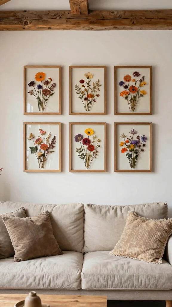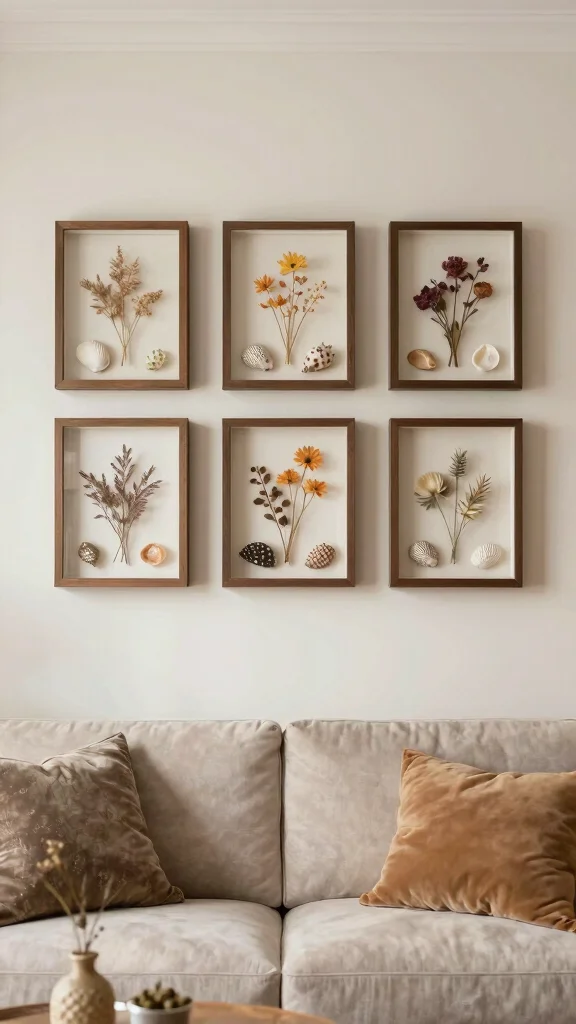Dried flower arrangements beautifully incorporate natural elements into your living room decor. These arrangements can be elegantly framed or displayed in glass boxes, providing a chic wall art option. Unlike fresh flowers, dried arrangements last longer while adding a rustic, organic feel to your space.