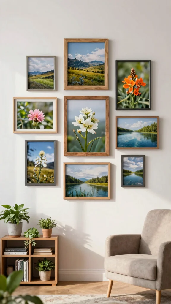 Start with a focal piece and build around it using a grid or salon-style layout for balance. Keep a cohesive framing color or material (e.g., natural wood or black metal) to unify the collection. Mix sizes but maintain a rhythm with even spacing, like 2–3 inches apart, to avoid a cluttered look. Use upcycled frames or reclaimed wood to anchor the display and anchor with a slim shelf or a botanical plant for a natural touch. This approach aligns with interior design ideas and wall art ideas for living rooms while staying eco-friendly.